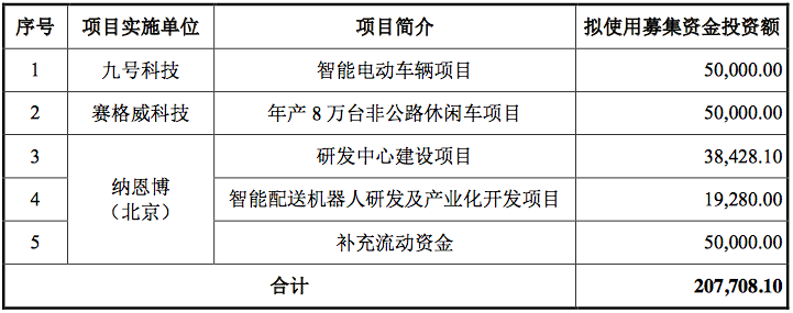 此次上市,九号智能拟募集资金20.77亿元,主要用于智能电动车辆项目、年产 8 万台非公路休闲车项目、研发中心建设项目、智能配送机器人研发及产业化开发项目、补充流动资金。