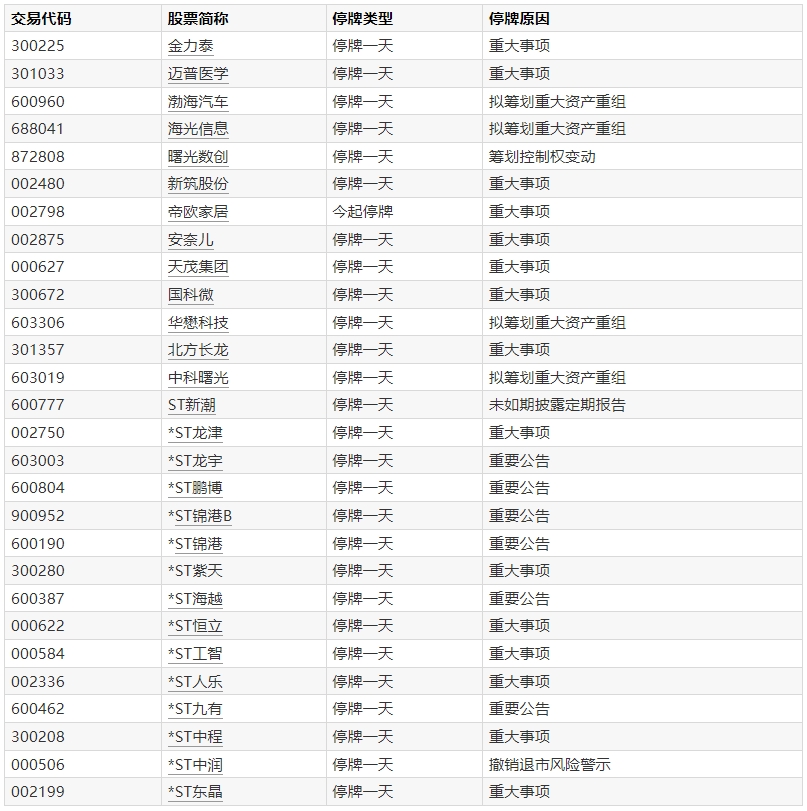 A股停牌提示:28股今日停牌A股停牌提示:28股今日停牌