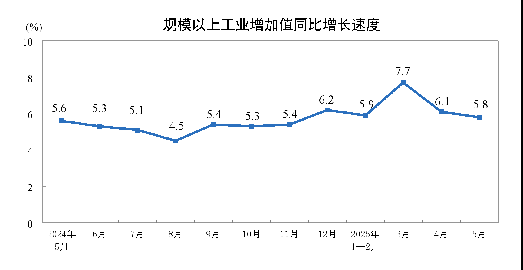 5月份,规模以上工业增加值同比实际增长5.8%(增加值增速均为扣除价格因素的实际增长率)。从环比看,5月份,规模以上工业增加值比上月增长0.61%。1—5月份,规模以上工业增加值同比增长6.3%。